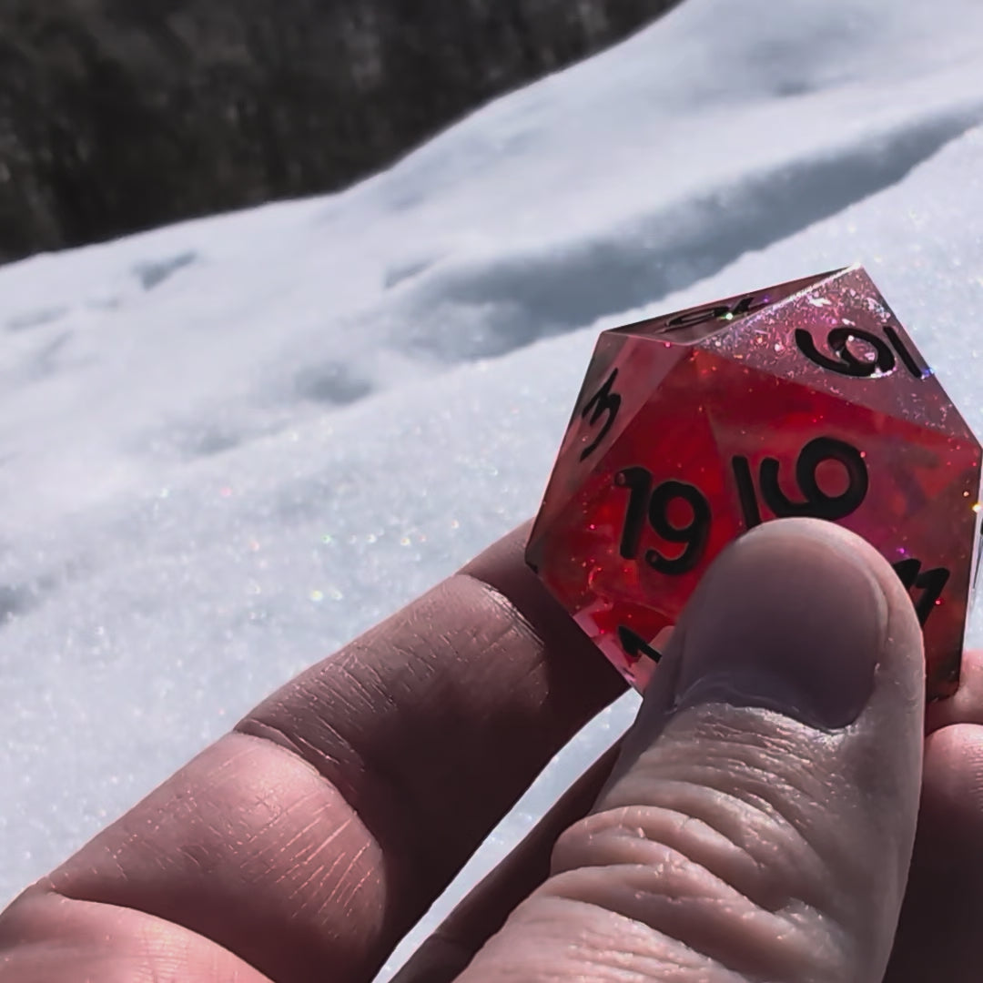 A 30mm sharp edge d20 chonk made from red resin dye, red mica glitter powder, red and orange cellophane and the numbers are painted black. When you caught the light it kind of looks like a fire glowing inside.
