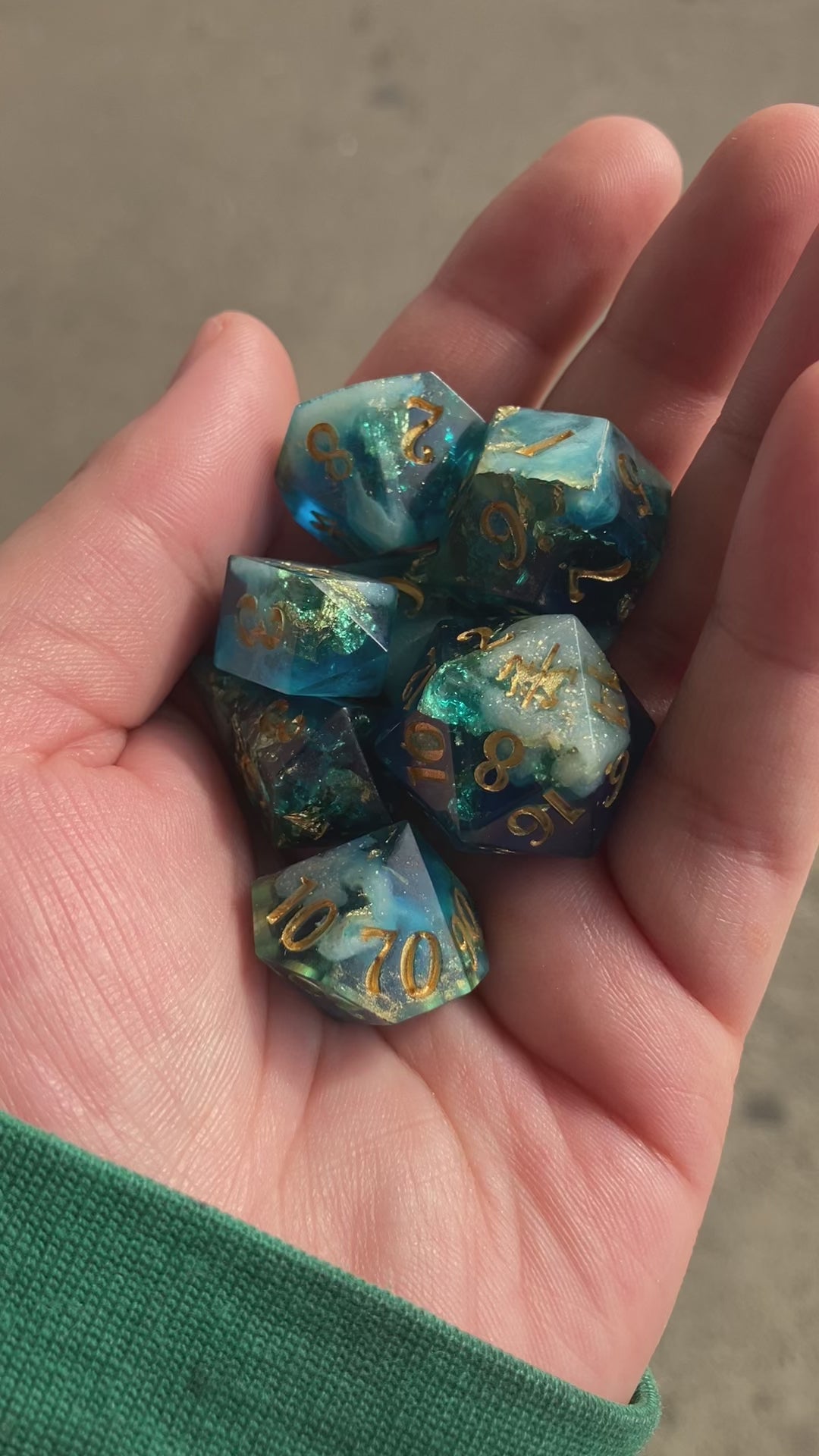 Standard 7 piece set of blue resin polyhedral dice with glitter and gold foil.